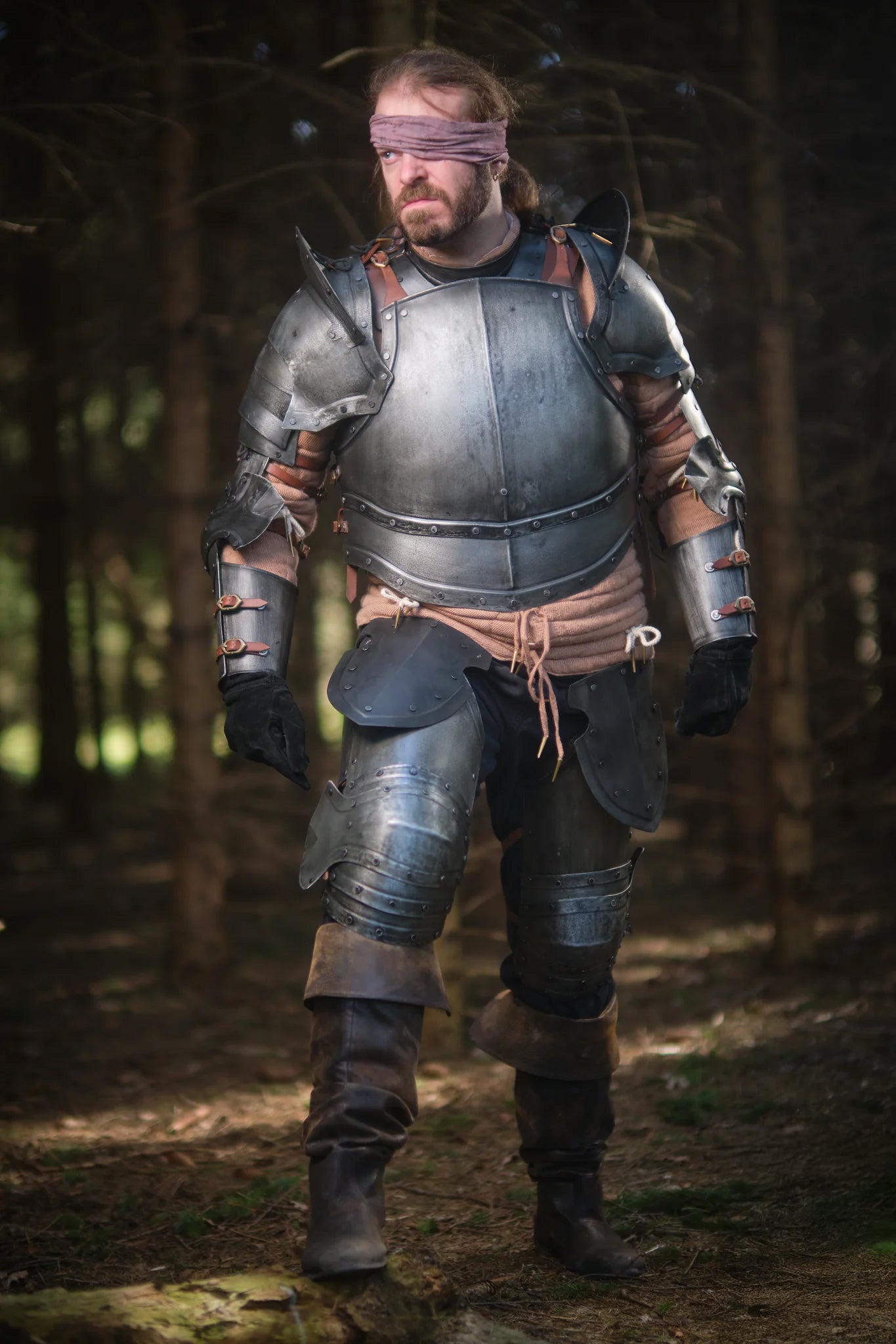 Soldier Gorget worn by a man in a black tunic, showcasing its simple design and great protection outdoors.Soldier Gorget worn by a man in medieval attire, showcasing simple design and protection for the shoulders.